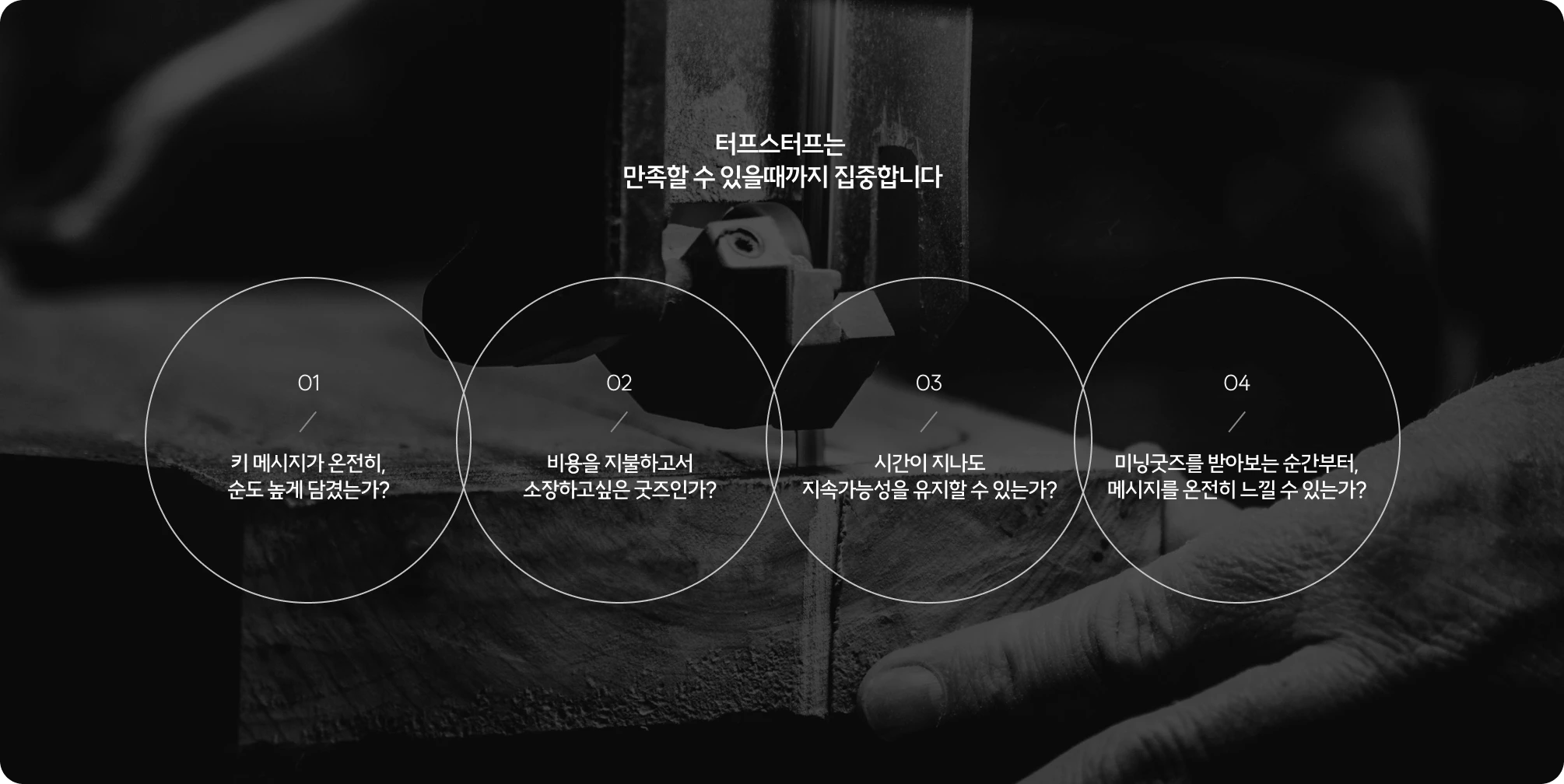 미닝굿즈 본래의 목적을 상기하며, 터프스터프와 클라이언트 모두가 만족할 수 있는 제작을 지향합니다.