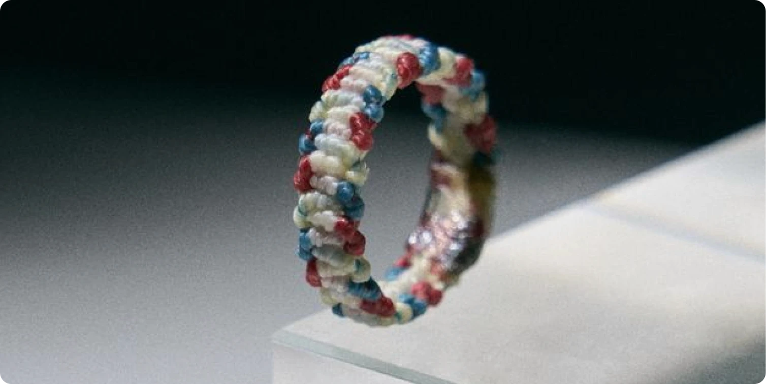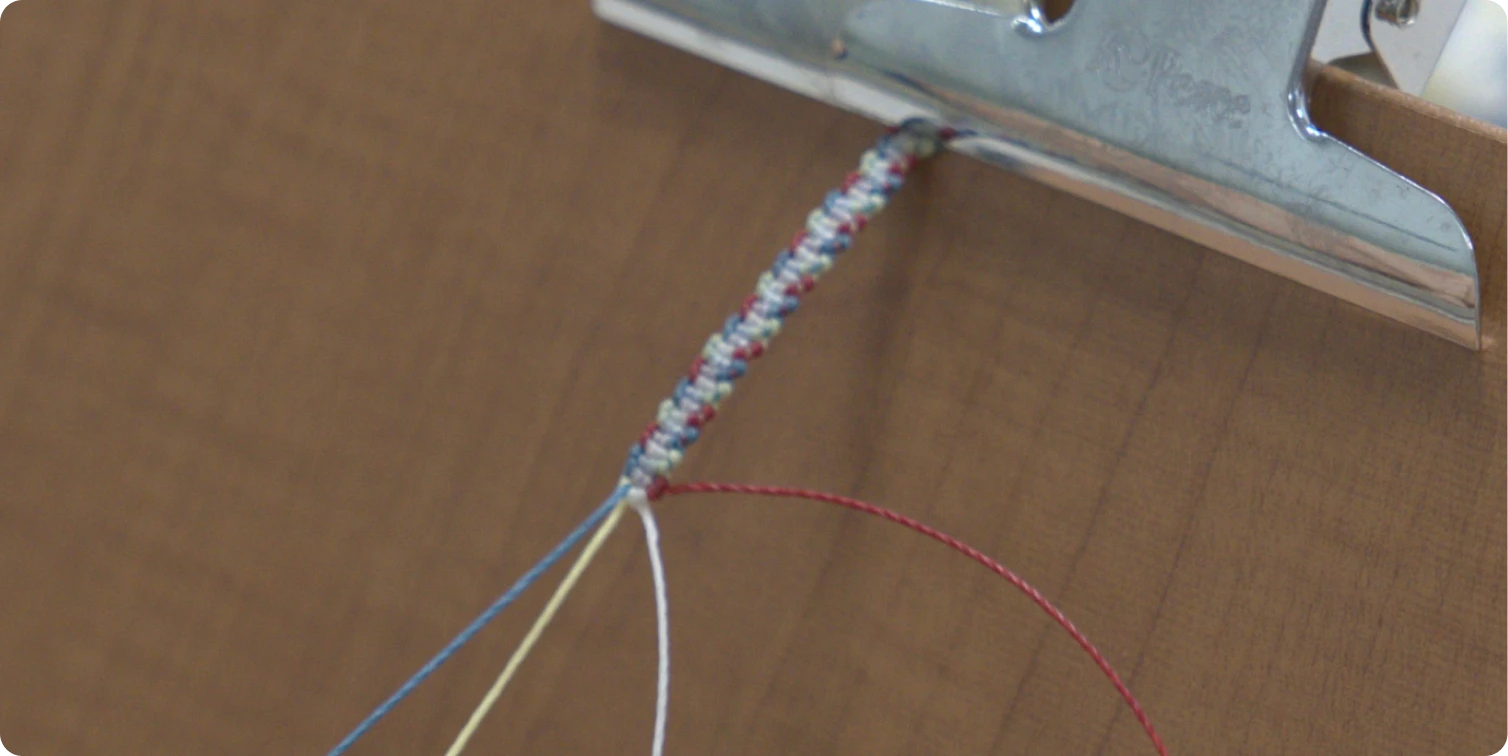 참전국을 의미하는 네 가지 색상의 실로 매듭 반지를 엮어냈습니다.